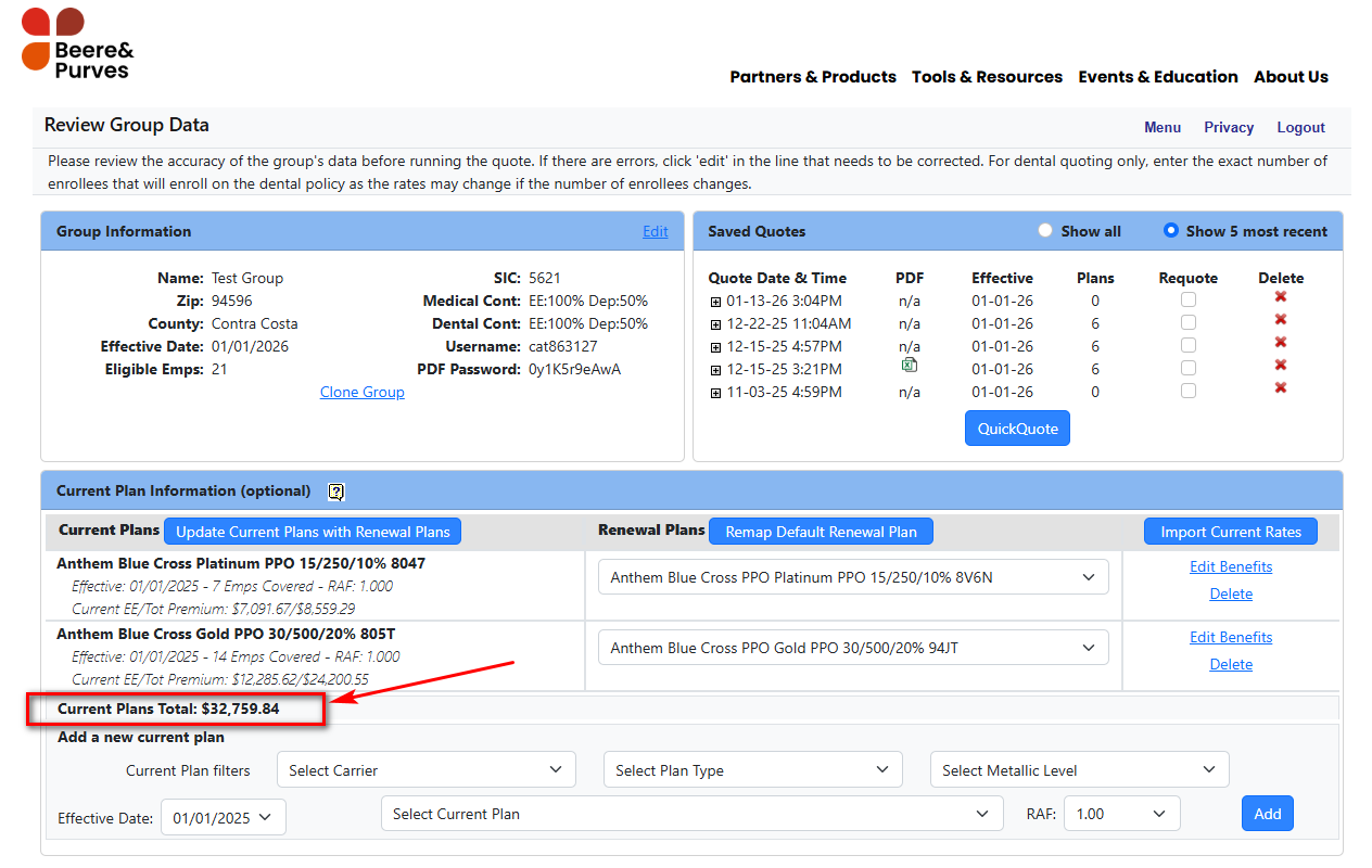 You’ll now see a Current Plans Total on the Review Group Data page after adding Current Plans and importing Current Rates for a group. Previously, only per‑plan totals were shown, which made it harder to verify the amounts against a group’s bill or another source.
