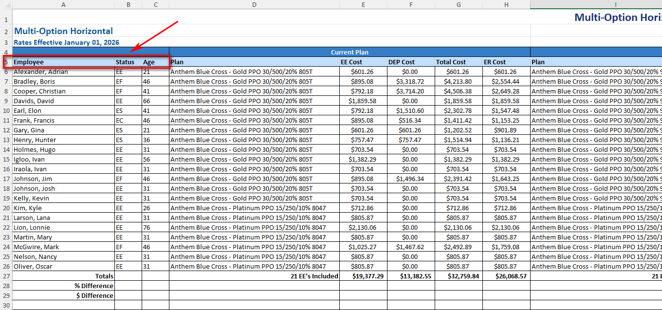 Last month, we announced the new Multi-Option Horizontal Excel export option in bpQuote. This update improves the export format by splitting the Name, Status, and Age fields into their own columns, making it easier to manipulate data in Excel if needed. Previously, the report exported the Name, Status, and Age of an employee in a single cell which was more challenging to work with.