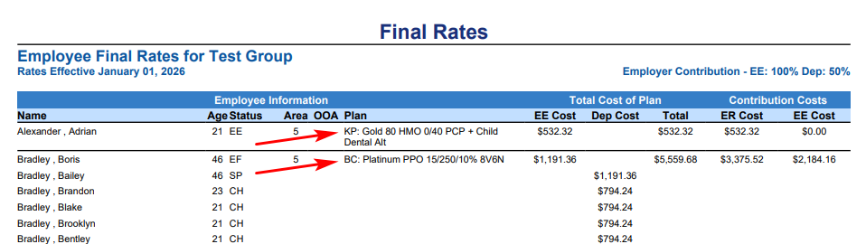 The Final Rates Report now includes the carrier initials next to the plan name so you can easily identify the correct carrier and plan for employees. This update is particularly helpful when selling two or more carriers together, especially if the plans names across those carriers are very similar.